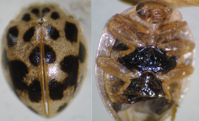 Now we can make more sense of what it looks like. You can see the 20 spots, the texture of the shell, and what it looks like underneath. The anatomy can only tell us so much about the species, so to learn more about how it lives, let's turn to a paper published in 2009 by Sutherland and Parrella (citation can be found at the end of this post). It turns out that this lady beetle (and the others in its subfamily Halyziini) isn't predacious like most other lady beetles, nor does it eat leaves: it feeds on various mildew fungi. These are fungi in the order Erysiphales, which cause powdery mildew diseases in plants, hence their common name.